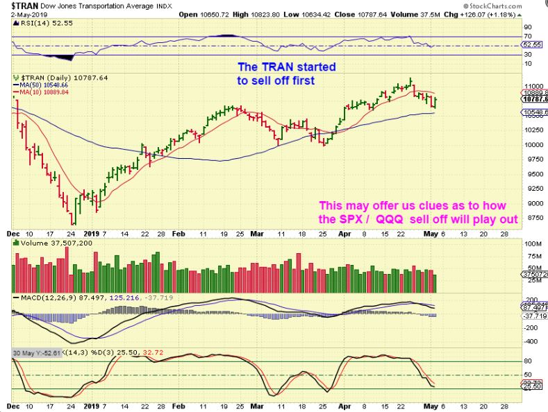 TRAN – The TRAN started selling off last week, so maybe it will give us clues along the way. Does it hold support? Does it break support? It is almost oversold and at support, so things seem orderly at this point.