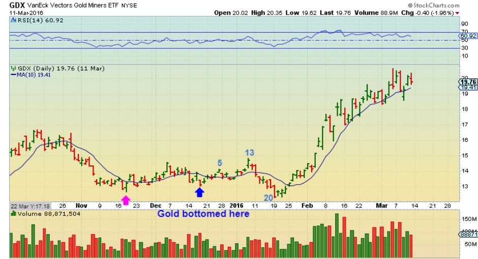 MINERS Looked like they bottomed in November .  OF COURSE WE ALL KNOW THAT MINERS BROKE DOWN BRIEFLY AND BOTTOMED 1 MONTH AFTER GOLD & SILVER.   This type of confusing action,  with Gold bottoming, and Silver breaking down,  and then Miners dropping to new lows much later,  got everyone to throw in the towel and give up on Miners.   THEN IT TOOK OFF HIGHER.  We bought it and rode it higher here in January after being stopped out.