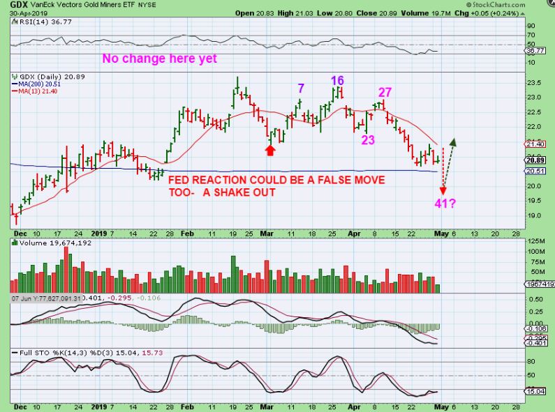 Did we have all of our questions about the Precious Metals answered on the F.O.M.C.Day?  No, unfortunately we got the same old directionless whip saw,  with lows being taken out by Silver and Miners, and Gold holding up into the close.  So that leaves us wondering :