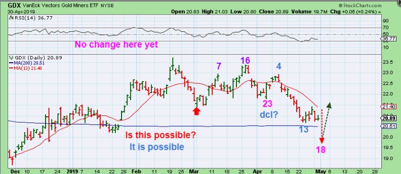 GDX  – This was in yesterdays report too, as if we saw a short 23 day daily cycle.  Day 23 would be a DCL?  I see this as less likely.  This would obviously mean more selling since we’d only be on day 18.  This is when stops will take you out and we can buy much lower.  How might this play out if it was day 18? …
