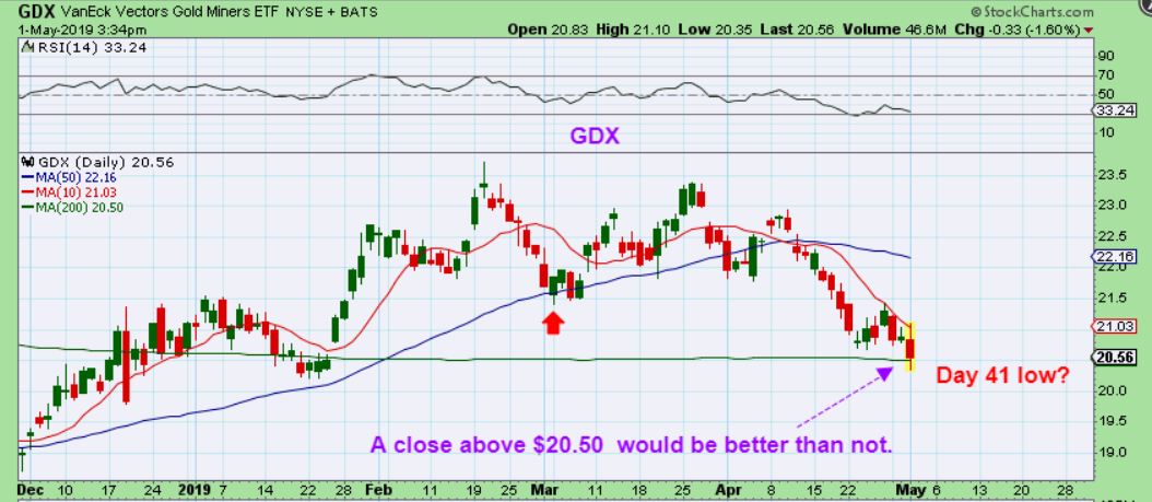 GDX 3:34 p.m.  –  I posted this 1/2 hr before the close,  saying that if GDX can close above $20.50,  it closes back above that 200sma.   That could be a day 41 dcl,  since Gold held up.  Now we need time to see if this holds or let’s go.