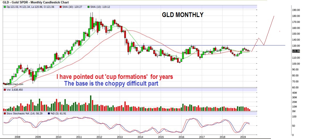 GLD MONTHLY – This Monthly chart shows years of churning & building energy in a base building process.   Yes, it is difficult trading these daily cycles. When this finally breaks out higher,  the gains should be very good and very fast.  That break out & run could come after the next ICL is defined.   This will be a giant Cup & handle.
