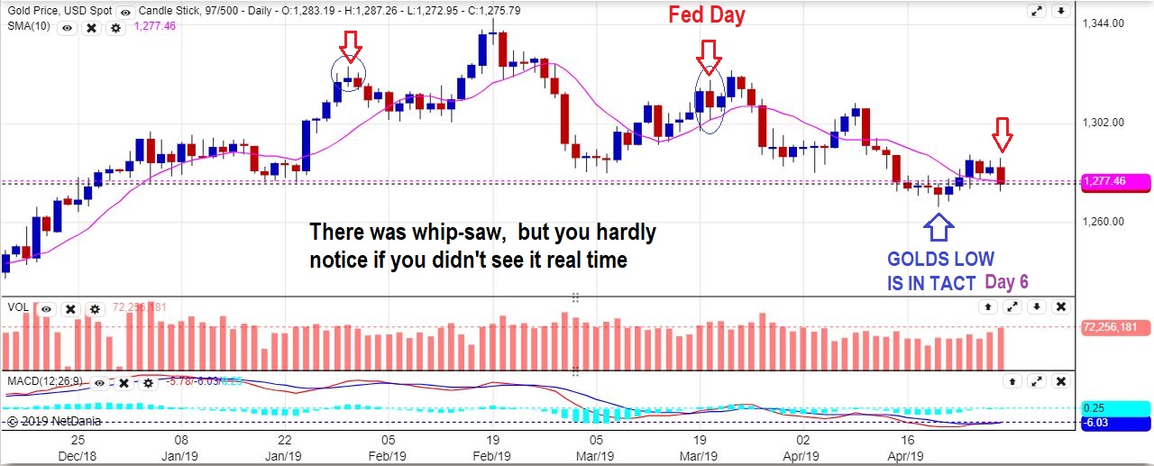 DAILY CHART :  Some people got out of work  and this is all they saw on the daily chart.   What Fed Rally & Crash?  The daily chart of Gold at the close looks ‘ok’.    So for GOLD, it still may be a normal day 6, with the low in place.   SO FAR.