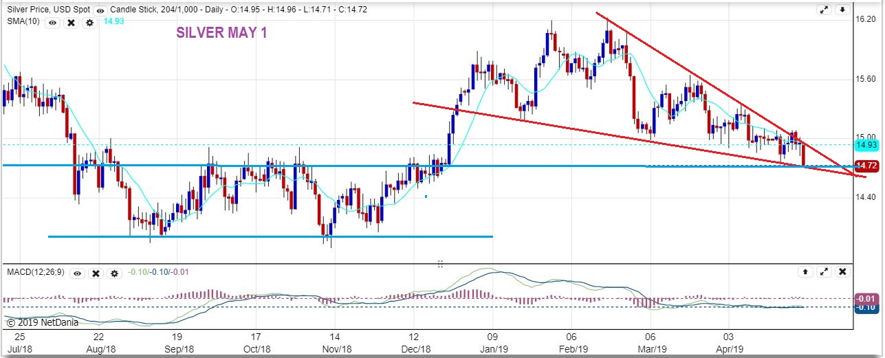 SILVER BIG PICTURE –  However even with that drop, this wedge and support can still be considered  valid, as long as it doen’t break down Thursday or Friday.  If it does fail, Silver could drop to the bottom of the base.
