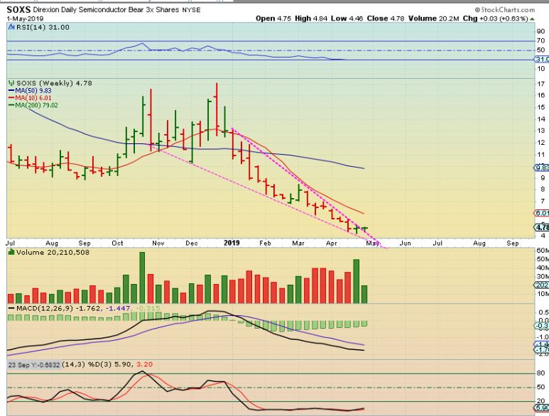 SOXS WEEKLY (for experienced traders)  – SOX WKLY has a break higher too.  I am expecting a pull back in the General Markets.