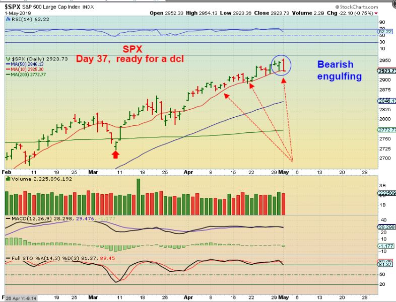 SPX DAILY  – We have been looking for a top to form around the Fed Meeting.   This is a bearish engulfing on day 37,  and I would expect these highs to be the peak for now and we should see the drop over time.
