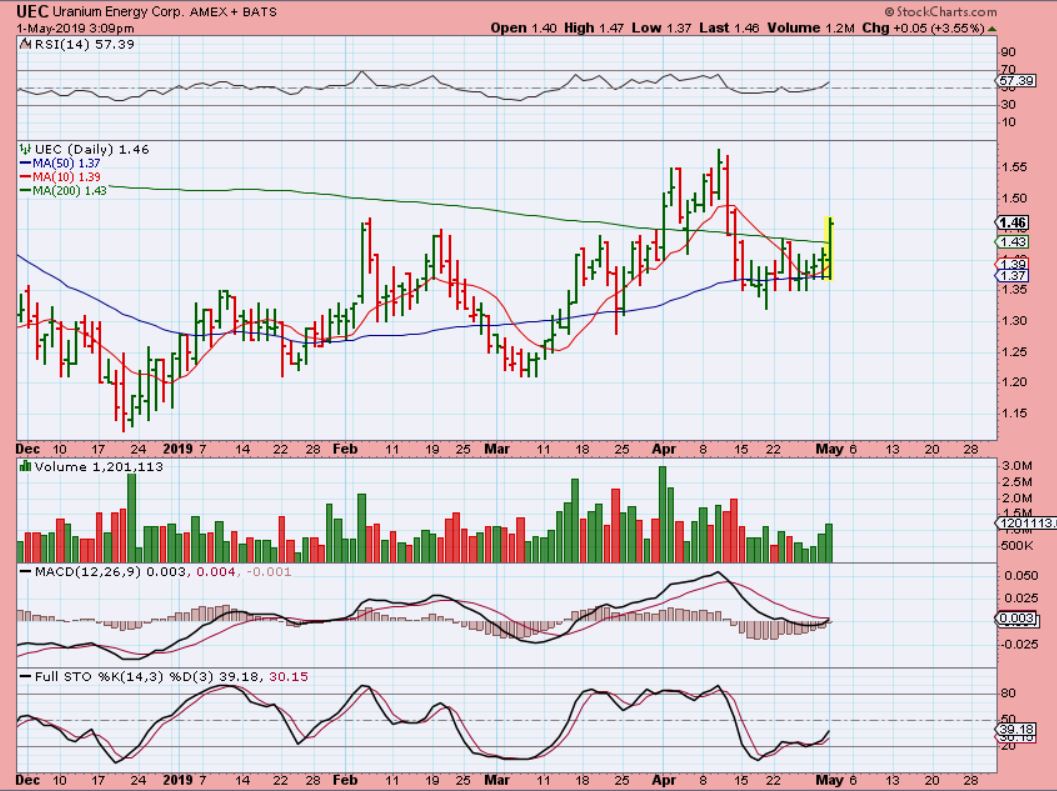 UEC – UEC reversed off of the 50sma and broke through the 200sma.   These have been very choppy and hard to trade, but this is a bullish set up.