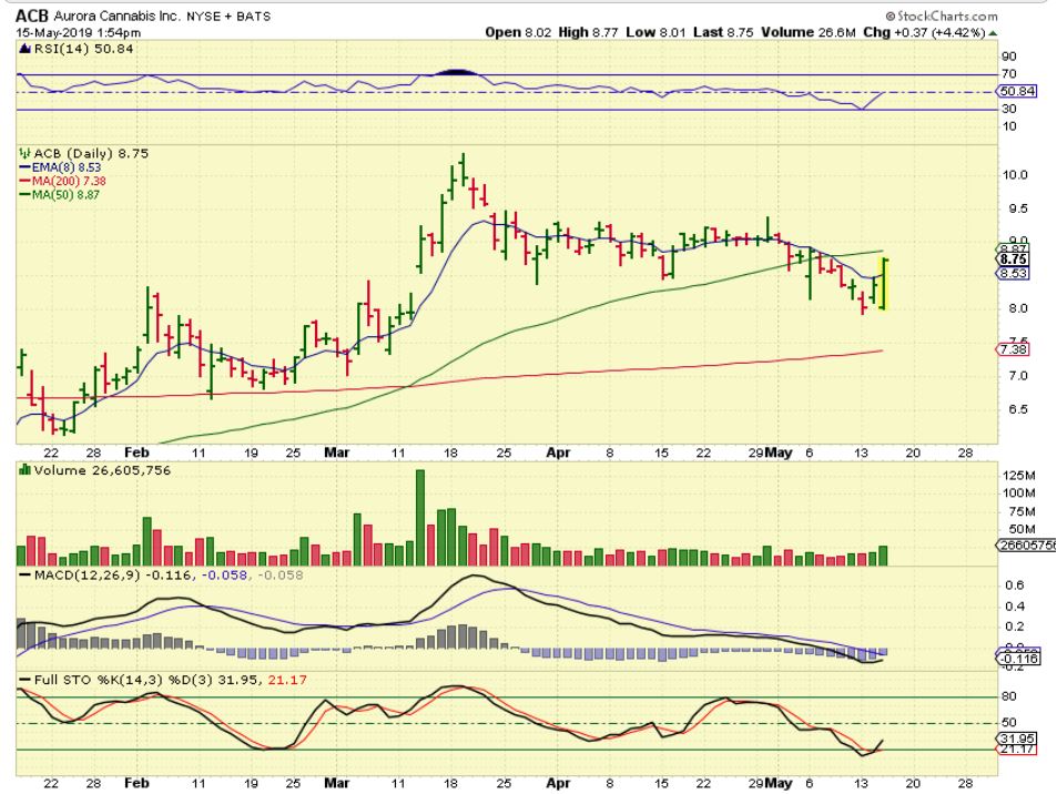 ACB – After a GAP DOWN, Buyers definitely stepped in, and I think that ACB is about to rally again after a 2 month consolidation. In 2019, ACB ran from $5 to $10. That is not a Bull Market? This is a normal consolidation, and it can now run to $12 or more, in my opinion.
