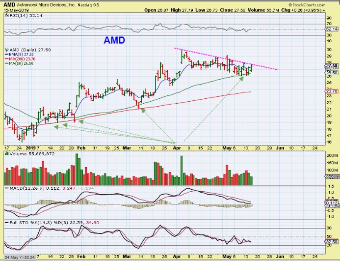 RECENTLY ON MAY 10 I MENTIONED LOOKING FOR STOCKS THAT DID NOT SELL OFF AS MUCH AS THE MARKETS, AND I MENTIONED A FEW LIKE AMD, SHOWN HERE FROM A PRIOR REPORT, ON THE 50SMA.