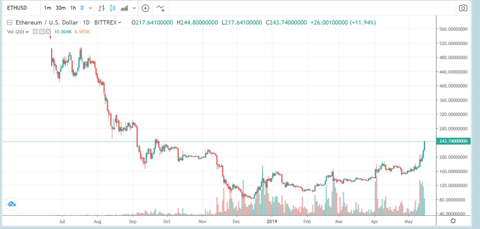 ETHEREUM – ETH has a similar base and started breaking higher too . This sector is firing on all cylinders ! This just ran from $150 to $243 in weeks, so it also could pull back, but over time I think that these are going higher.