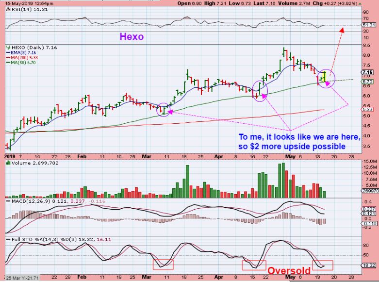HEXO – In 2019 alone, HEXO ran from $3 to $8.50. That is not a Bull Market? THAT is a BIG RUN, yet people doubt that it is in Bull Mode because it is a bit choppy? 2 years ago HEXO was $1.oo. $1 to $8.50 is not a Bull Market? So here it is reversing at the 50sma again. Huge volume has been coming in, and I posted that I bought this yesterday in the live commenting area. It is still a buy, especially if it dips down today or remains choppy above the 50sma.
