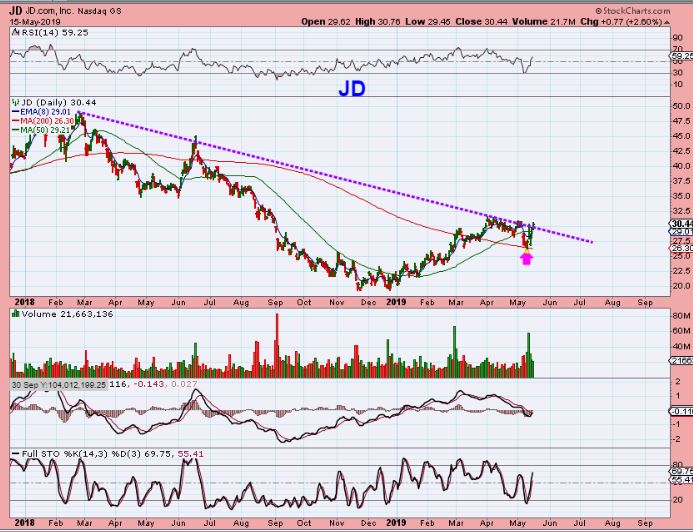 JD – The Bigger Picture has the recent pull back to the 200 sma as a normal dip after a strong run, and it looks ready to break from a 1 year down trend.