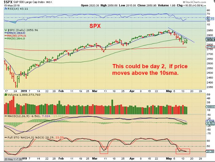 SPX – We are now late in the timing for a daily cycle low, and price is pushing on the 10sma and the down trend line, so a break above that area should imply that the lows are in place. That would be a low risk entry with a stop right under the low. Can this still drop to the 200sma? Yes, so that is why it was best to wait for further upside confirmation, but WE ARE CLOSE OR THERE NOW.