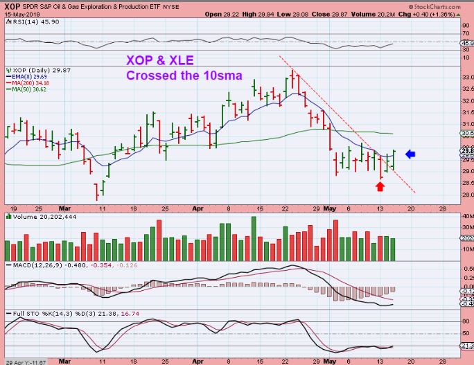 XOP ( GUSH) – The XOP & XLE have stabilized and crossed the 10sma ( OIH fell sharply and is turning higher, but hasn’t crossed the 10sma). This would be a buy with a stop under recent lows. That makes it lower risk. GUSH is leveraged. Many Energy stocks should begin to set up bullishly too.