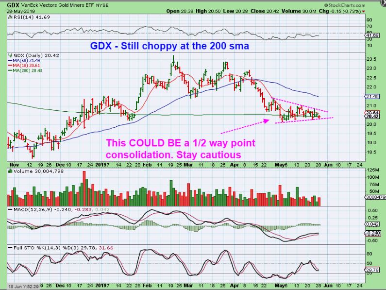 GDX –  GOLD & SILVER sold off and Miners sold off just a little bit too.  GDX was down 15 cents and remains choppy.  A triangle can be a consolidation and continuation of the trend ( which was down), so be careful if you are in it, use stops, keep positions small.   There will be no big loss here if someone bought the lows and gets stopped out, but this choppiness is frustrating and boring.