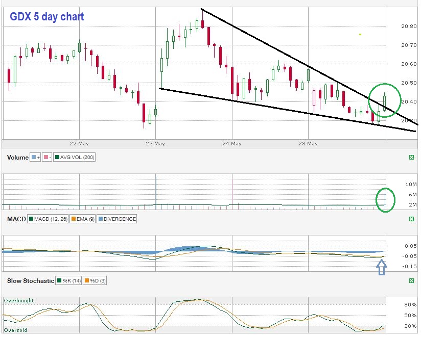 GDX AT THE CLOSE –  At the very close, GDX popped out of a downtrend on the 5 day / 30 minute chart, so maybe it’ll bounce higher Wednesday.   We’ll see, but even so, it could just remain choppy .