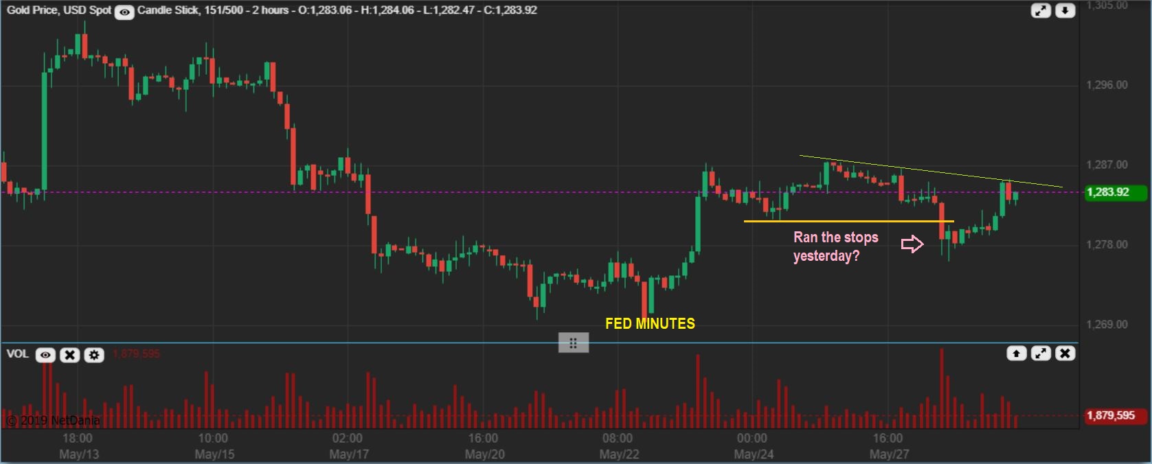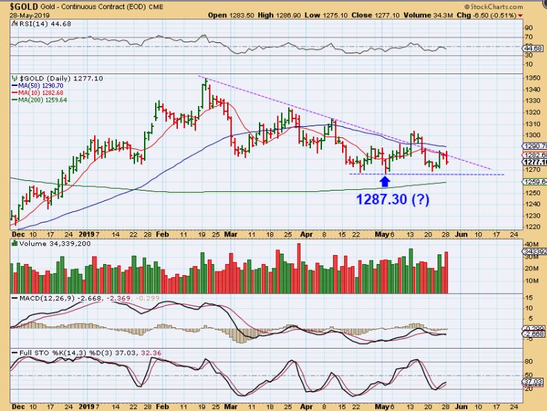 EDIT : GOLD LIVE 7 a.m. Eastern Time  – I thought that I would look at this choppiness close up on a 2 hr chart.  Gold rallied at Fed Minutes, and it broke down Tuesday, possibly running the stops. Since then, Gold is now up a little bit as seen, but remains choppy.  A break above 1288 would be nice, since it could lead to a run to recent highs.