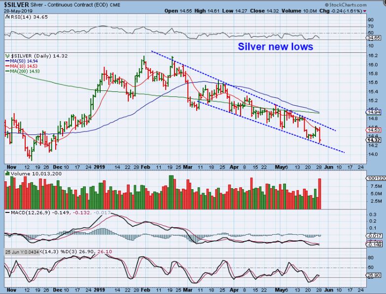 SILVER  – Silver broke down to new lows. Gold hasn’t broken the lows, but Silver has no sign of good buying in Silver.