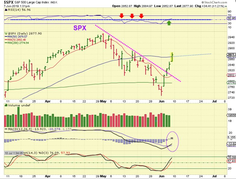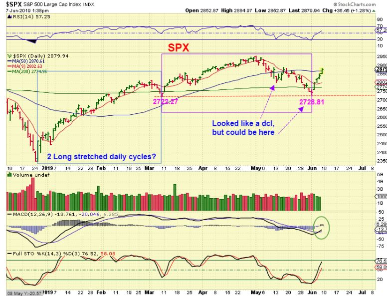 SPX DAILY – Do you see what I mean? May 13 looked like a dcl, but now this one does too. There have been only 14 days from May lows, but the Fed Rate Cut program seems to have pulled in the buyers. So ignoring cycles, I’ve mentioned that these lows could be bought with a tight stop and now I’d say that the ‘stop’ could be raised.