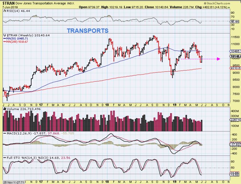 TRANSPORTS – We have a reversal in the sell off, but you can see that recent March & April lows were broken on that drop. Usually lower lows is a bad sign, but we need to see if these markets will get any follow through upside to negate the bearishness. Is this bounce a recovery ( fed Rate Cut Promises) or just a bounce in a new downtrend?