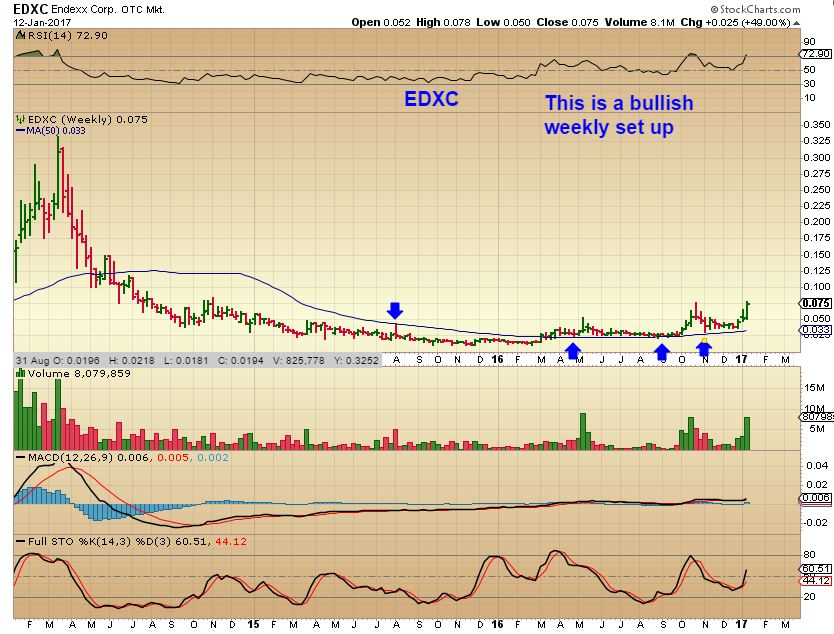 EDXC – I was buying EDXC at 2 & 3 cents and put that in my reports. I liked the sector and the companies story. I said that this base would reward us one day. I actually held it for over a year+, and then it ran …