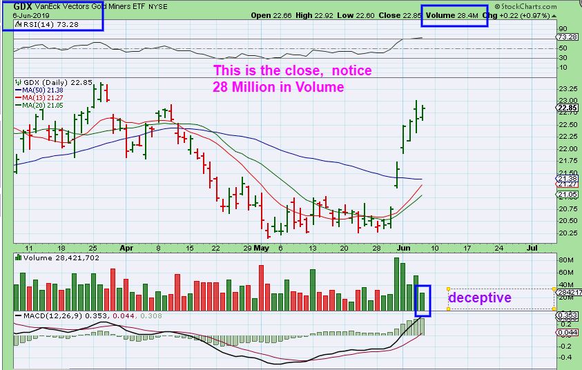 GDX – They added 20 million at the close. So if you see GDX or GDXJ rising and volume looks light, remember that they could add 10 to 25 million in volume at the close. It is very deceptive, but it is an adjustment that I made a long time ago.