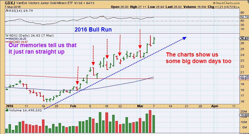 GDXJ 2016 – Another look at our 2016 run shows sort of a runaway move that locked out buyers waiting for the big dip to buy. Notice that it often had a sell off day big enough to wipe out the prior days gains. Those were big 1 day drops ( possibly scaring people out ), but within 1 or 2 days, it was at new highs again. THAT is why that move left people behind. A Big down day scared people out, but then the dip was too quick to buy. So we need to try not to let a big down day or 2 affect our Big Picture view.