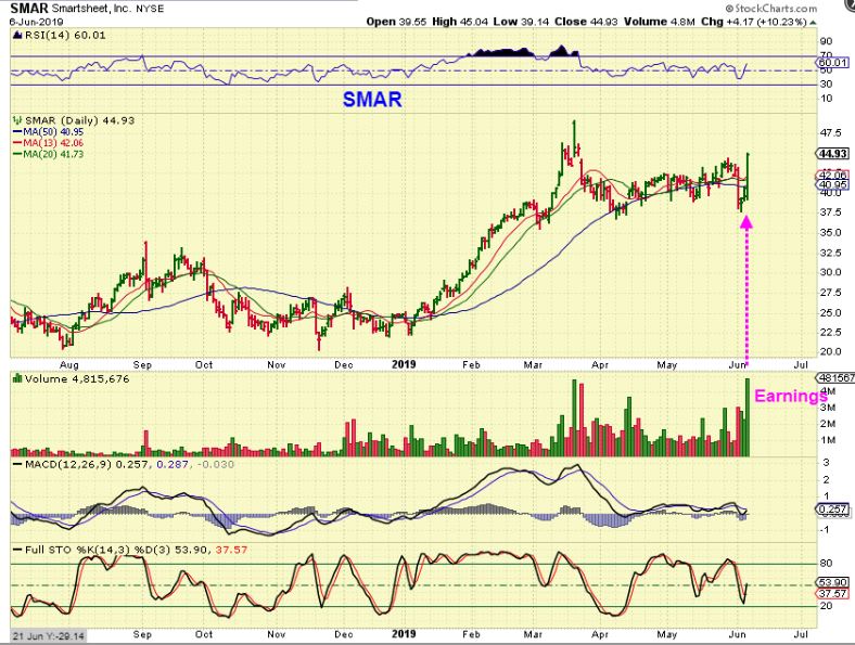 SMAR – Earnings has some stocks popping & some dropping, so it is really a mixed picture. High Volume reversal after earnings, this looks great. It can actually be bought with a stop at the 50sma, but maybe not if the jobs report drops the futures down.