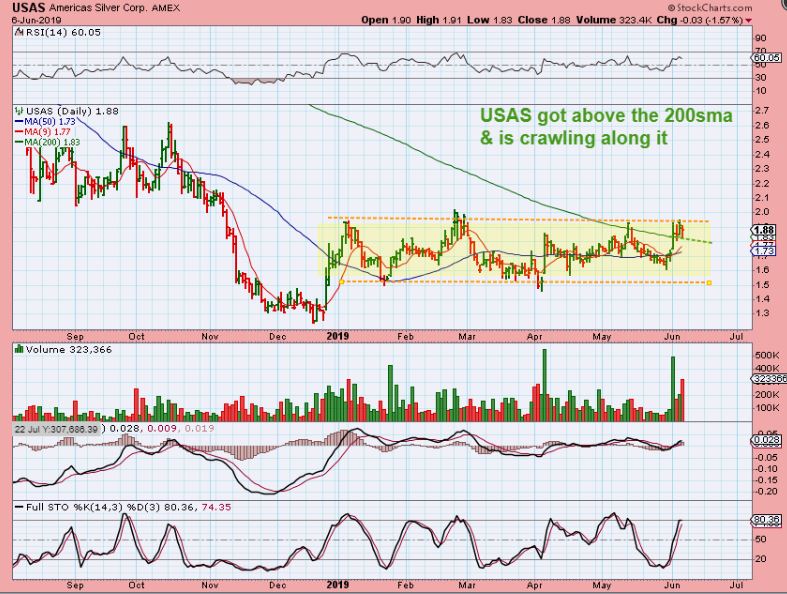 USAS – WE SHOULD BE LOOKING FOR PULL BACKS TO SUPPORT. USAS is in a base and dropped to support on the 200sma.