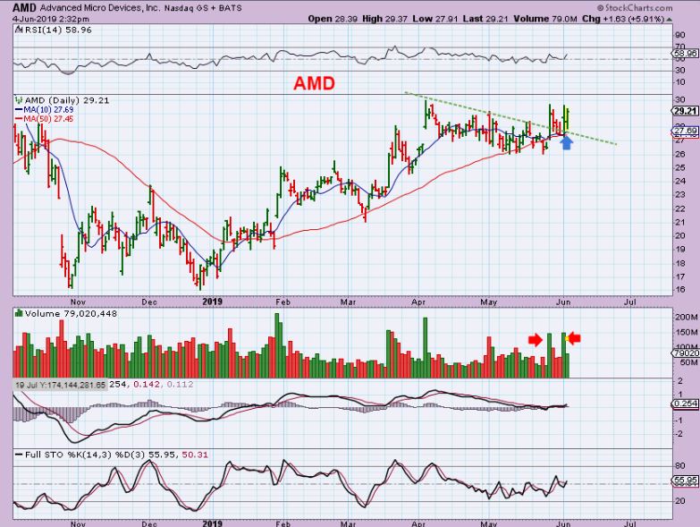 AMD – I have pointed out the bullishness in AMD a few times. This also has been VERY CHOPPY, but it really hasn’t been caught up in the market sell off, and looks to be breaking out now.