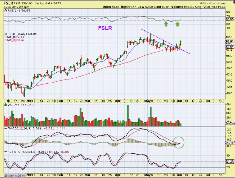 FSLR – Now First Solar has a similar set up and during that General Market sell off, it just dropped & found support along the 50sma. This break out can be bought. ( These are a bit choppy, but that may change).