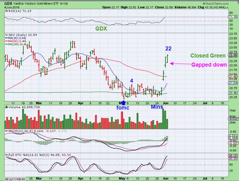 GDX – GDX was down for most of the day, but then some Miners started to rise and GDX & GDXJ both closed Green, even with the Markets bouncing. With a market bounce, most expect a gap fill after that gap down, so Miners are showing strength. So far we have a 3 day runaway move that many will not dare to buy.