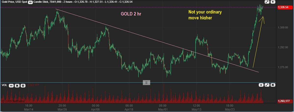 GOLD 2 hr chart– That was not a normal choppy move higher like those other runs. It was impulsive, straight up non-stop. This chart shows Gold as I write on Tuesday night & it is now flagging. It may not drop & end the same as other runs higher. It may bull flag and then continue higher.