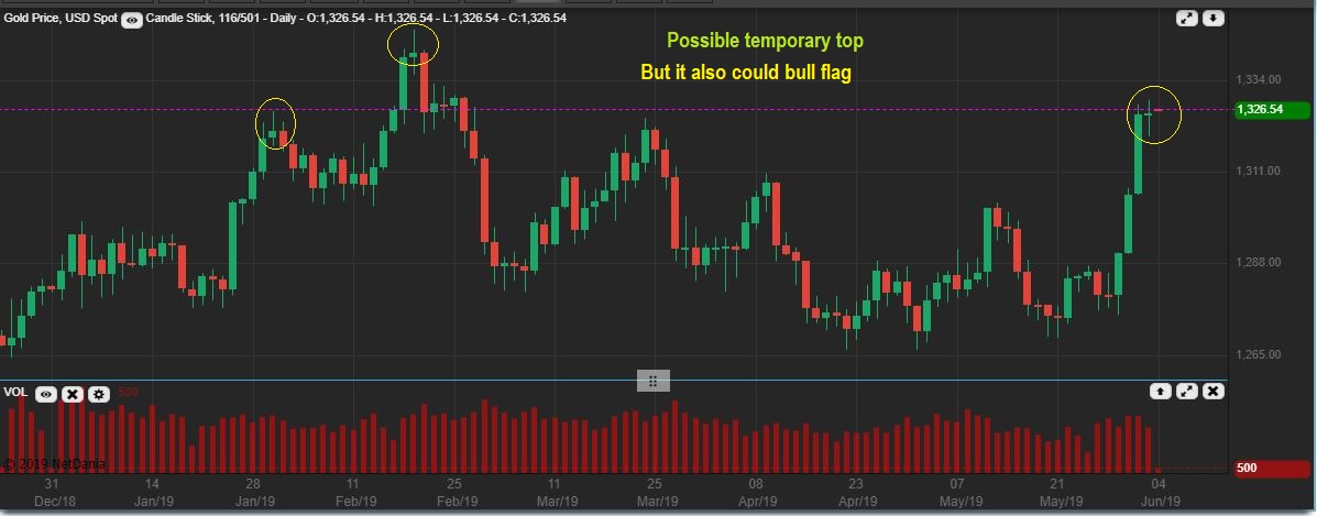 GOLD – A doji at the highs after a run can be a short term topping candle, but not always. After that big surge, this is probably not a top, it may be a ‘pause’. Let me show you why I expect more of a ‘pause’ than a top ( This could Bull Flag) …