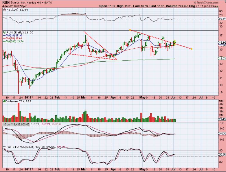 RUN – Run was a Buy back in March, and has set up as a buy again. This may or may not be ready, so it needs more of a break out. If it isn’t quite ready, it can drop to the 200sma 1 more time ( you can put it on a Watch list unless it breaks higher today).