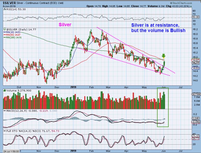SILVER – Silver hit resistance, but the volume seems Bullish. Silver could break through this area and really get moving, so I have been saying that you want to own Silver stocks.