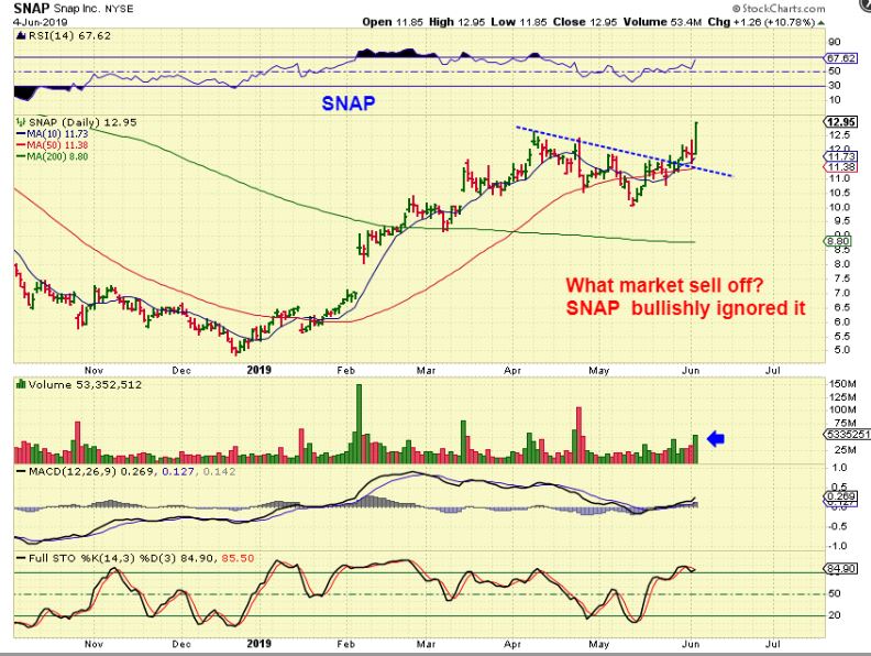 SNAP – This is the same lind of set up, but what makes this one seem really bullish is that the General Markets have been selling straight down and SNAP is already at 2019 highs with this break out. It had a power gap in February and never looked back.