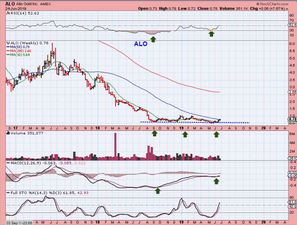 ALO – This is a massive base and this weekly chart shows strong divergence for the past year. THIS IS A LAGGARD WITH GREAT POTENTIAL. It is a buy here, or wait until it gets above the $0.79 (50 week MA).