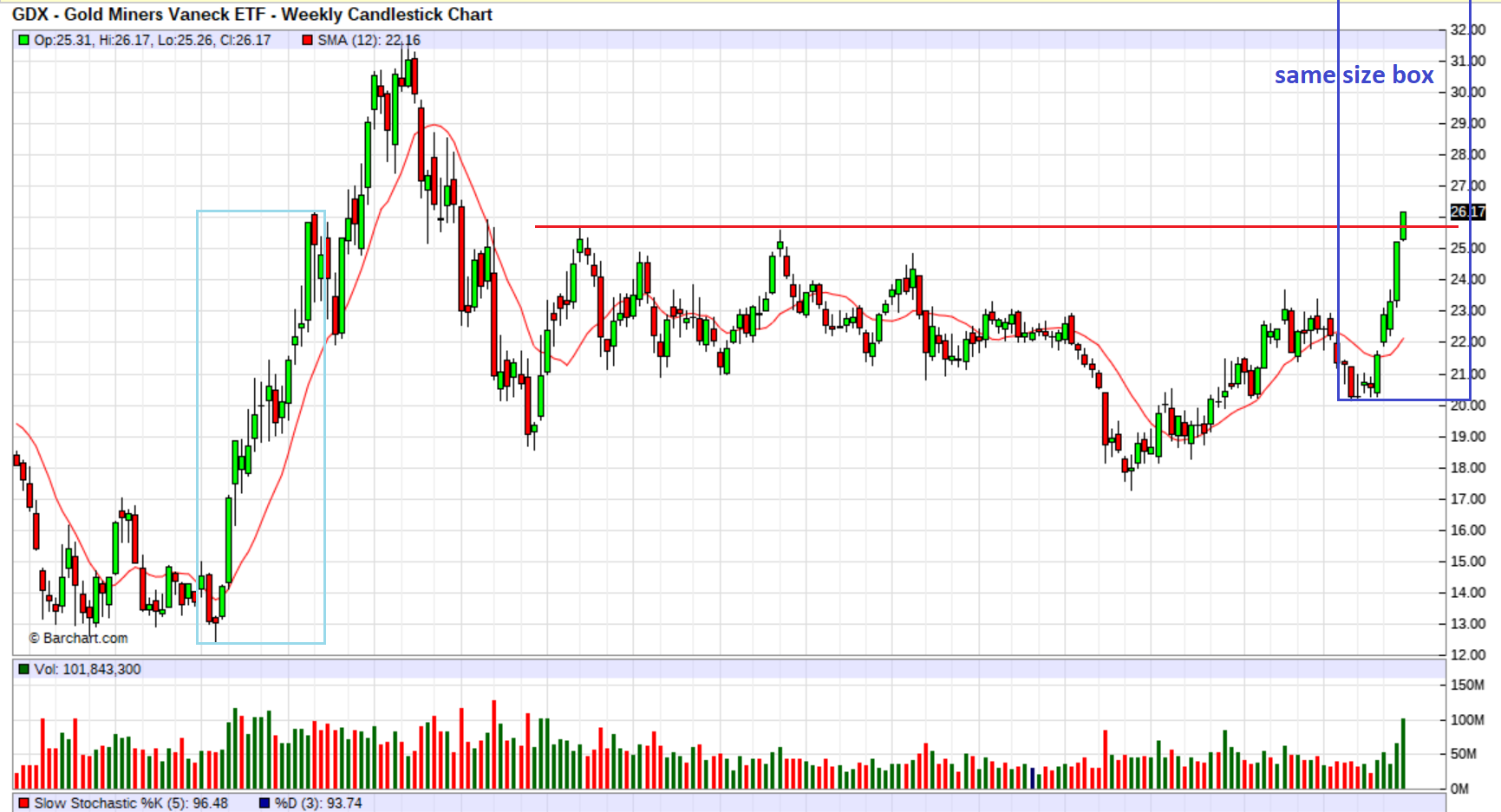 GDX – Not only are buyers flooding in, but ‘Shorts’ are capitulating. Those who shorted this thinking that it will crash, are deep in the red now. I drew a box around the 2016 runaway move & over-layed it to where we are now. It won’t play out just like this, but I am trying to show that shallow pull backs may be what we see for a while. Notice the volume needed to break through resistance from a base like this came in last week.