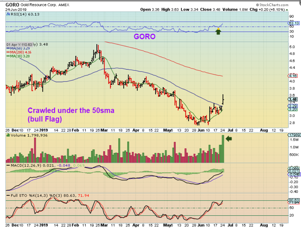 GORO – That pop was at the lows, then we saw a bull flag under the 50sma, and Monday it broke out. VOLUME is big, I think we have a battle of the bulls and bears, but the Bulls should win this one.