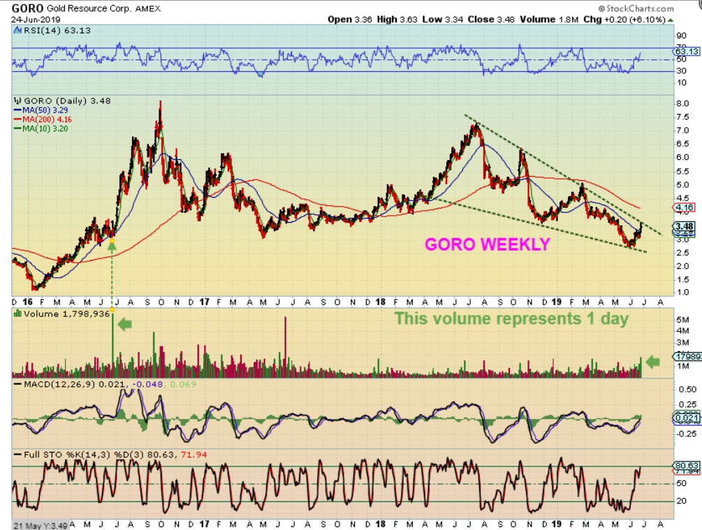 GORO BIG PICTURE- This is a Big Bullish descending wedge, and that Volume may be ready to push this up & through resistance. The weekly volume ( on day 1 of the week) is higher than the past years of an entire week. Wow.