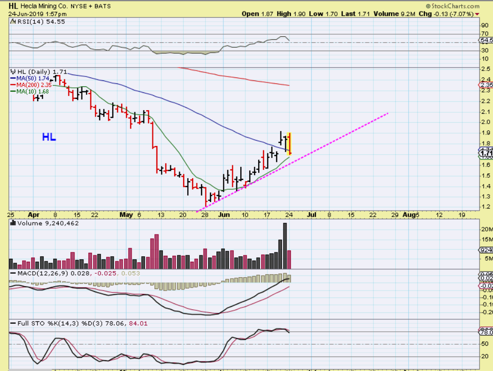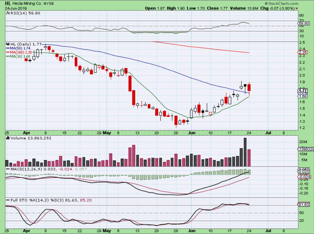 HL – L recovered after bouncing into the end of the day. It is again above the 50sma . Most Miners are surprising to the upside now.