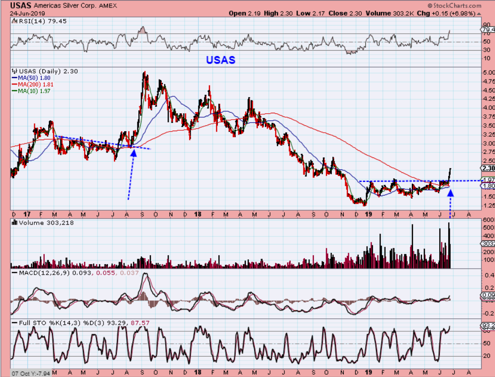 USAS – So the laggards are playing catch up. Look at that volume as it pushed higher over resistance. Let’s look for a couple more, as we continue to ride the leaders higher.