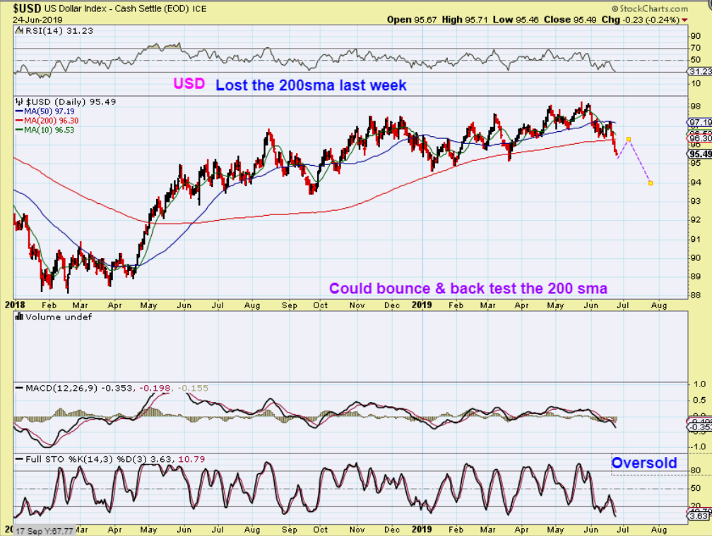 SHORT TERM: It is very oversold & could bounce & back test that 200 sma, but again, this may be very EARLY in the USD Daily cycle with more room to drop.