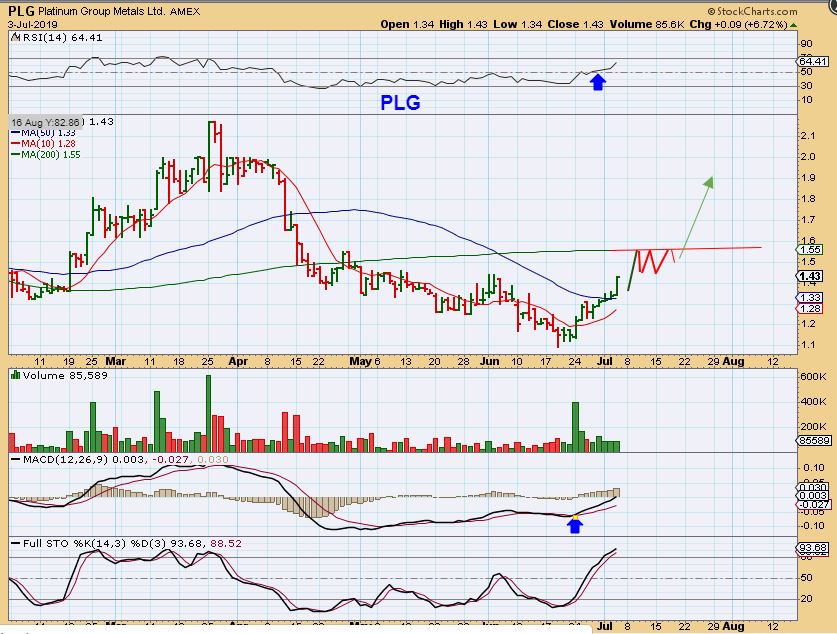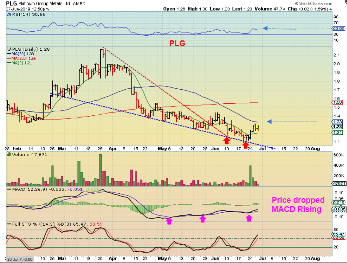 This chart of PLG was in my report June 28th, showing how it was possibly flagging under the 50sma (a BUY or buy the break out), and the MACD was rising as Price dropped. The RSI was pushing the 50% line too. PLG was $1.28