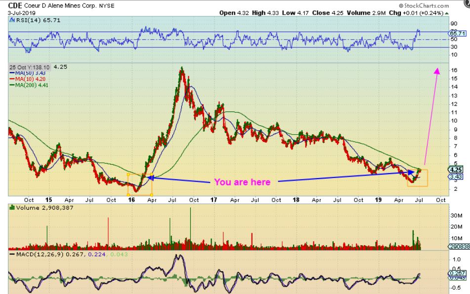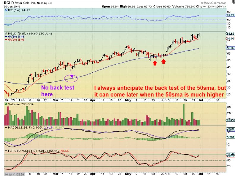 RGLD 2016 – Recently I showed this chart of KL from 2016. I was pointing out that in a strong move, it may not back test the 50sma until later. In Feb, March, April it just ran higher & back tested later- Higher up. I drew this so people wouldn’t SELL EARLY & TRY to buy a ‘back test’ later. Just ride them for a few weeks …