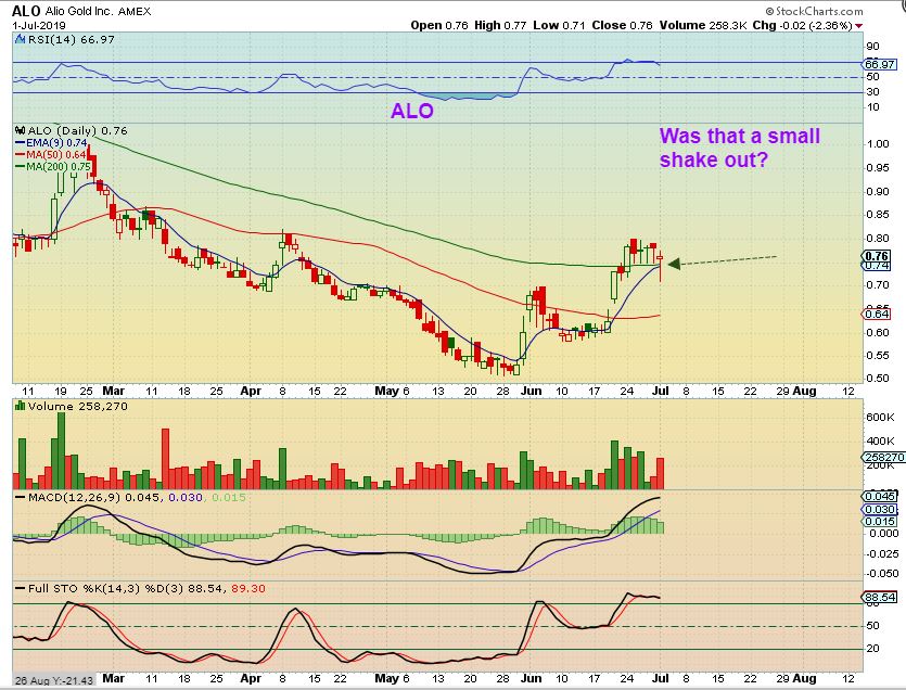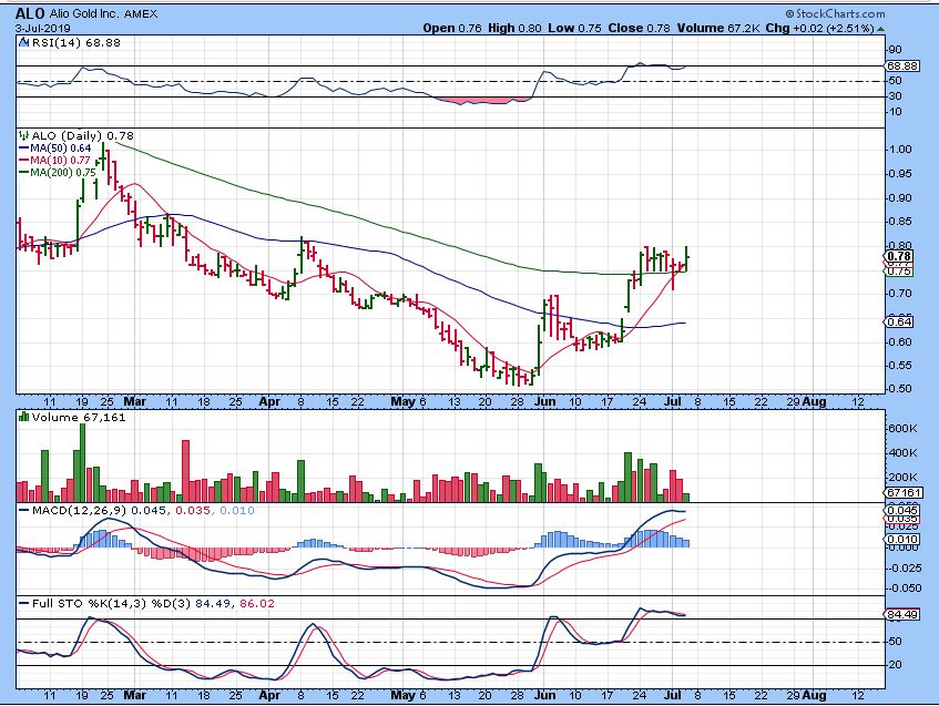 ALO – Today it is 78 cents again, still holding above that 200 sma.