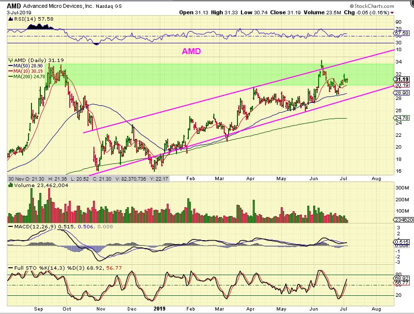 AMD – I kept recommending AMD at the 50 sma, but it wouldn’t just take off & run and I wondered why? I took a step back. It is a bullish set up, but AMD is pushing a resistance area, and doing so when the Markets have been choppy and sideways, so we’ll see if it can finally break $34 area on the next push higher. It is up 100% since January, but this would NOT be an easy ride.