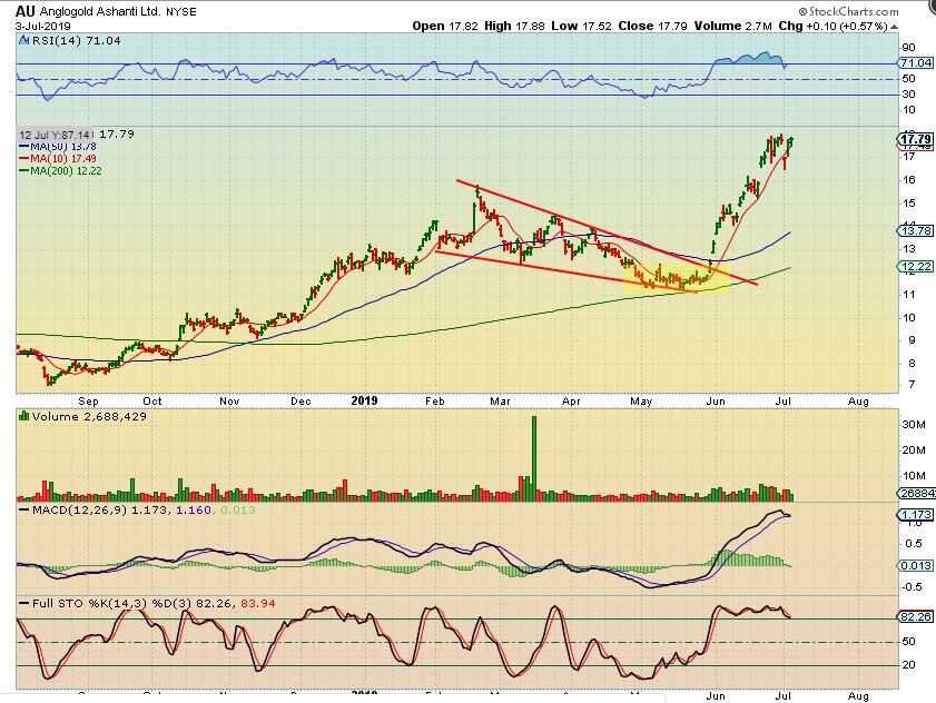 AU – This is certainly too extended to buy, but a great run so far. This was a buy as it tagged the 200sma at $11, or buy near $12 as it broke out. Almost a double.