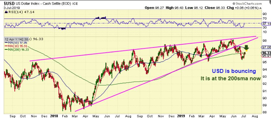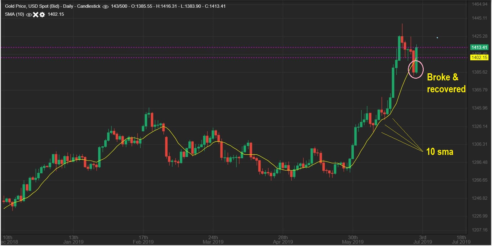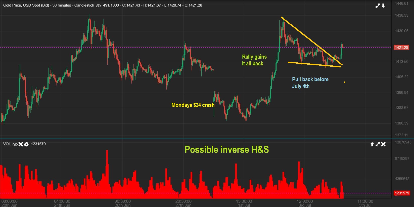 GOLD July 2 – The last time we looked at Gold, it fell below the 10sma, and then recovered. That looks like a dcl…